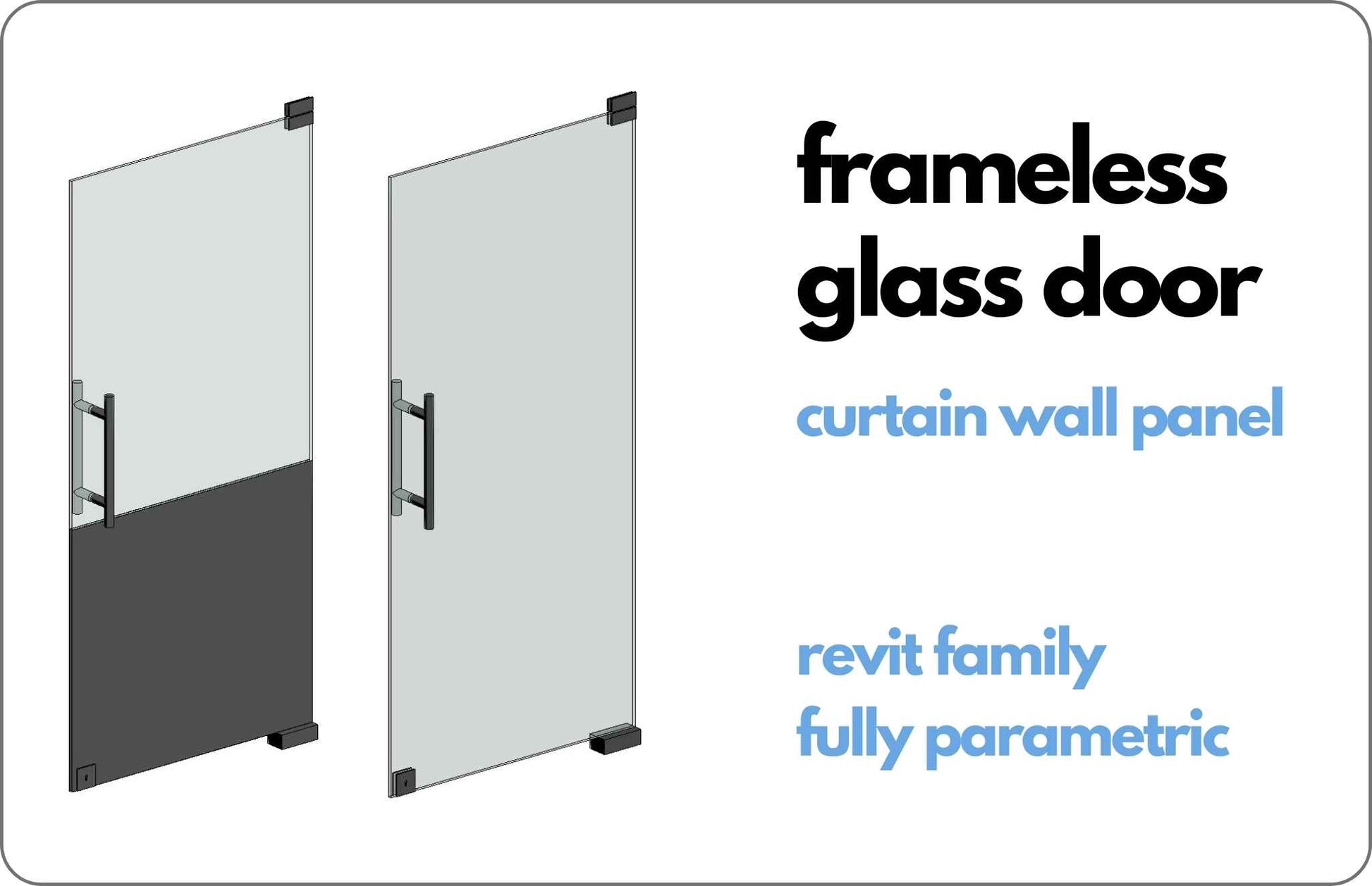 This is a fully parametric curtain wall panel frameless glass door revit family. Door can be placed on any curtain wall panel and use it either as an internal or an external frameless glass door. Can be used both for single door and double leaf door simply by adding two doors next to each other.