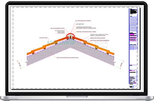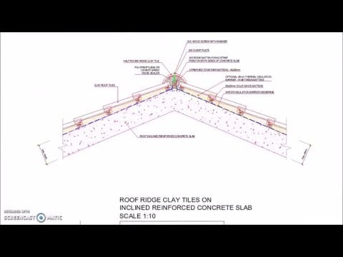 CAD dwg drawing for a Concrete Roof Slab Ridge Clay Tiles Detail. Pitched roof apex ridge detail, with standard type roof clay tiles on a reinforced concrete inclined ( sloped ) slab.