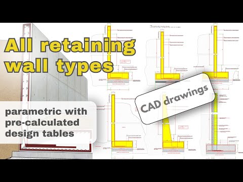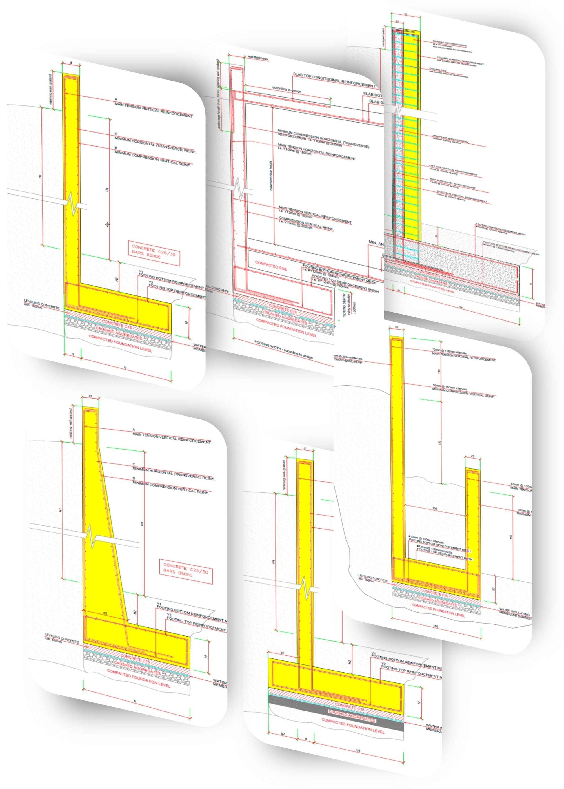 All types of concrete retaining walls, each accompanied with design parameters for many soil retaining loading variations to cover all design and drawing needs for all possible scenario cases.