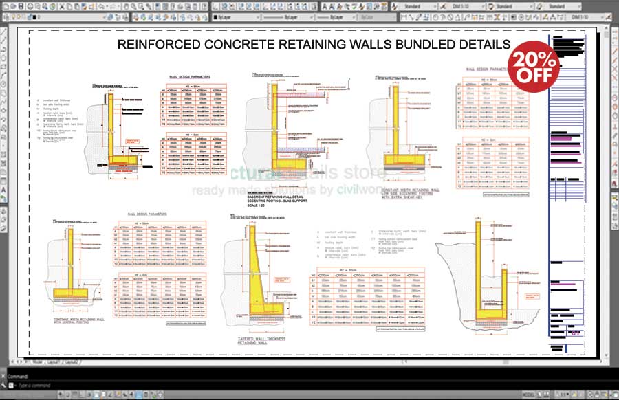 SPECIAL DISCOUNTED PRICE for our Reinforced Concrete Retaining Walls Bundled Drawing Details and designs.