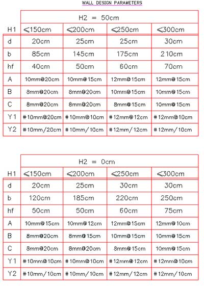 All types of concrete retaining walls, each accompanied with design parameters for many soil retaining loading variations to cover all design and drawing needs for all possible scenario cases.Wall design parameters tables
