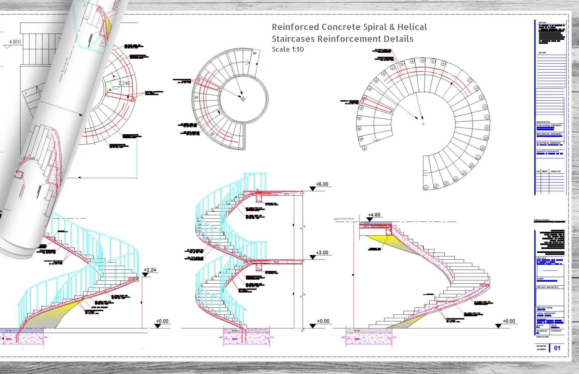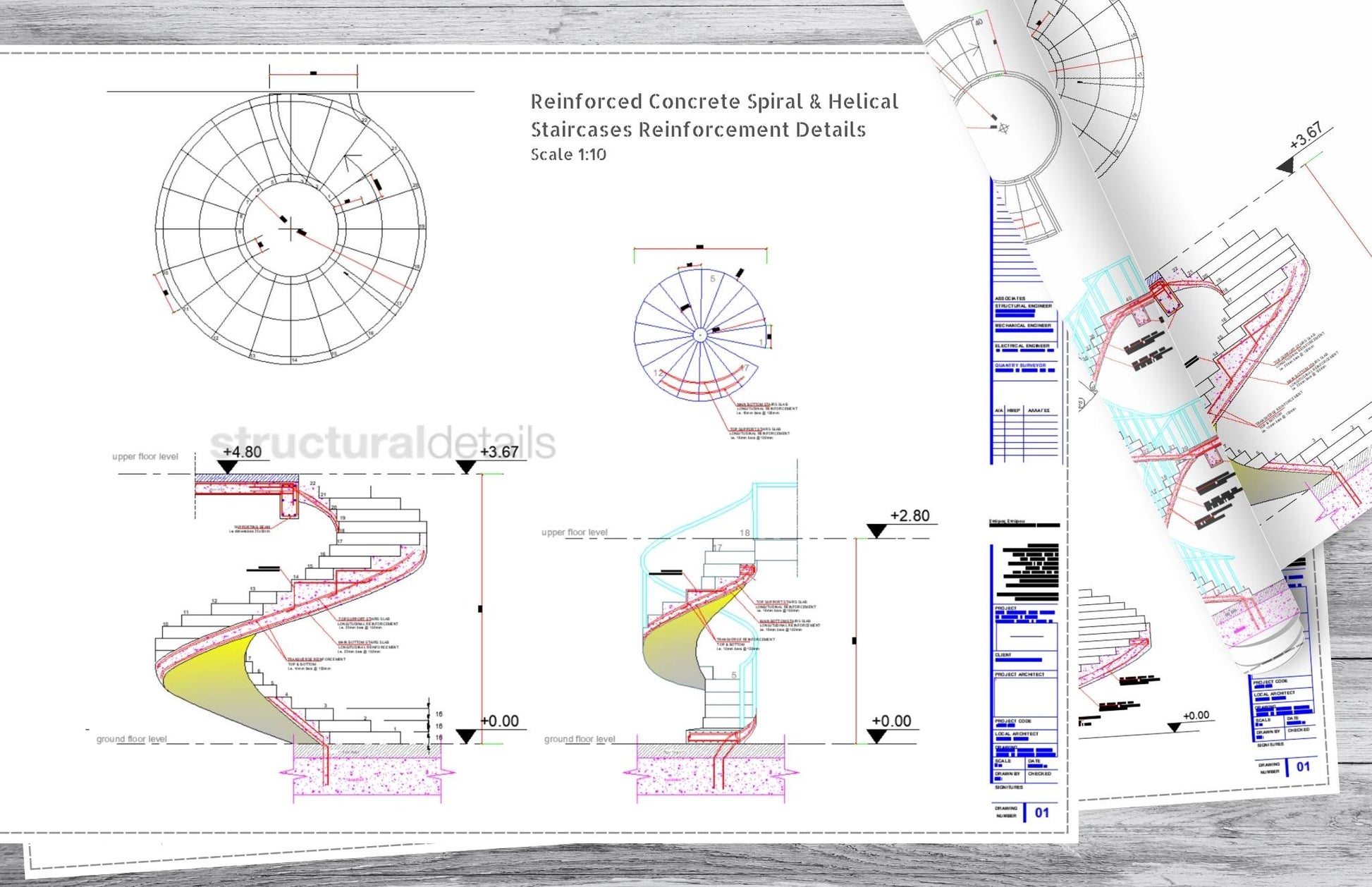 Complete set of CAD dwg drawings for Reinforced Concrete Spiral Helical Staircases Reinforcement Details. One of the most difficult design tasks, is now ready and available to use with every project.