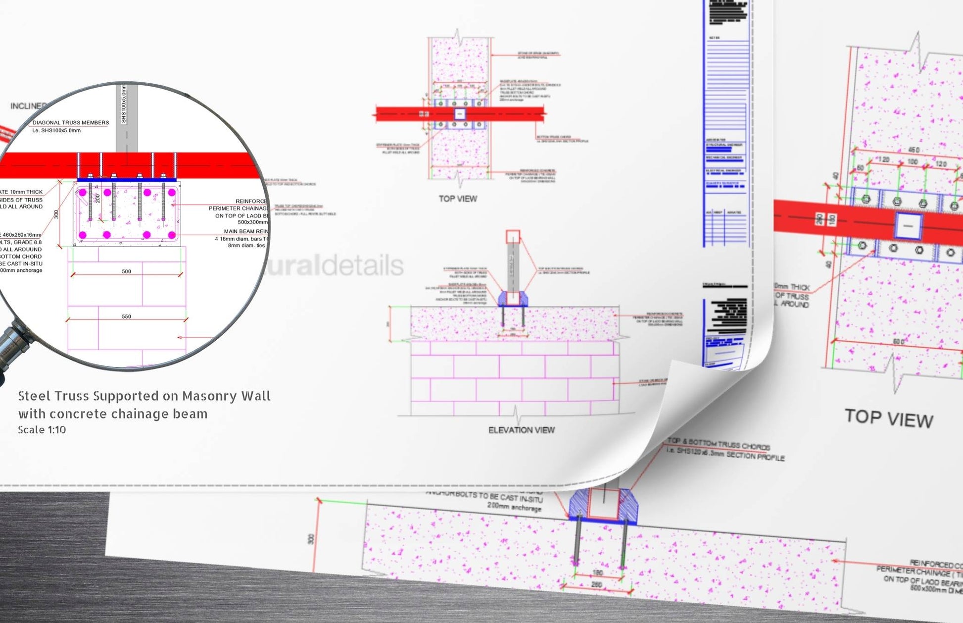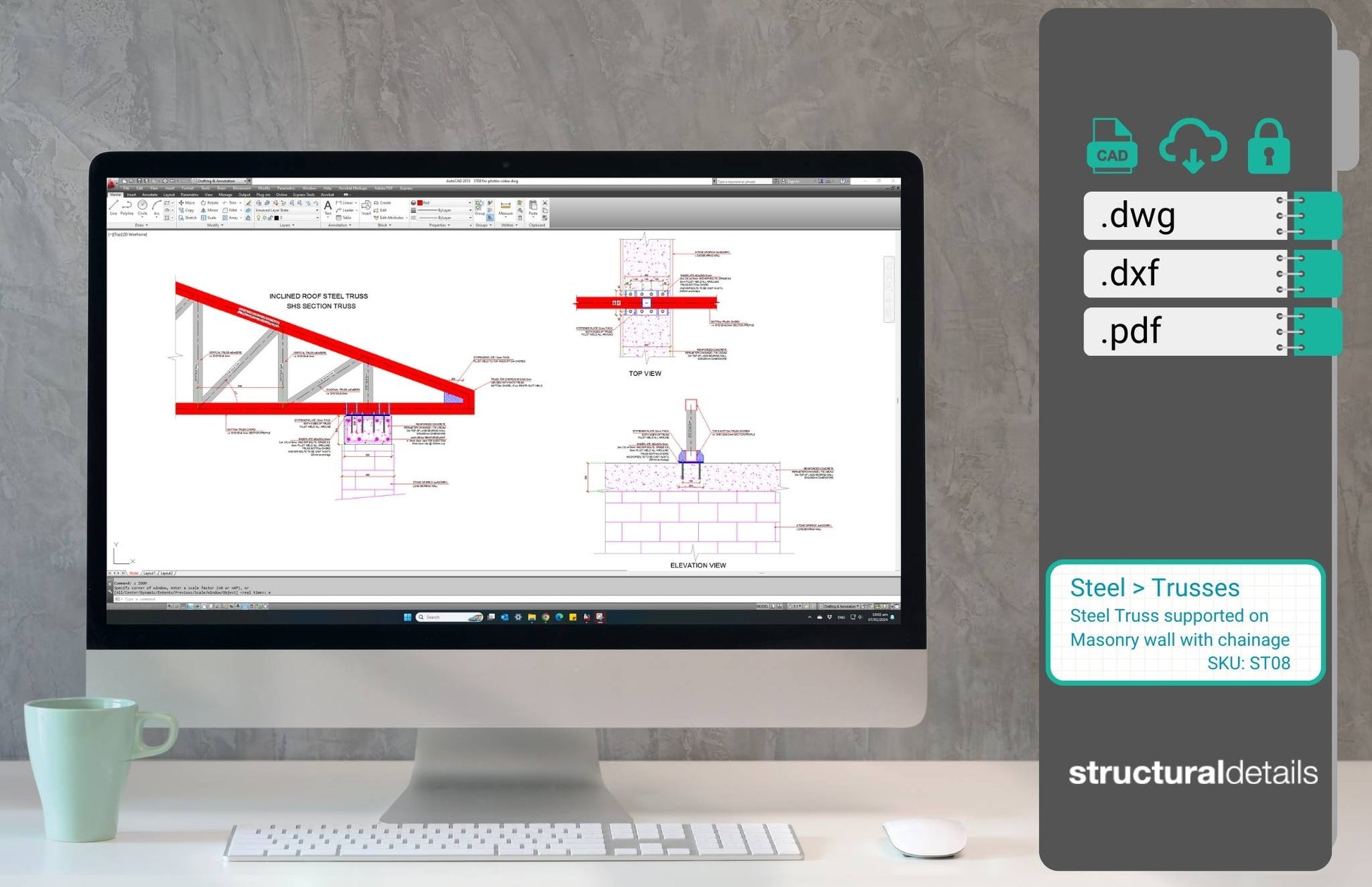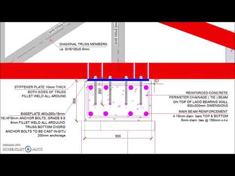 This is a CAD dwg drawing for a Roof Steel Truss Supported on Masonry Wall with Concrete Chainage Beam. Steel truss is consisted of SHS profile members. Bottom truss chord is connected with a moment resisting baseplate detail on top of reinforced concrete chainage tie beam.